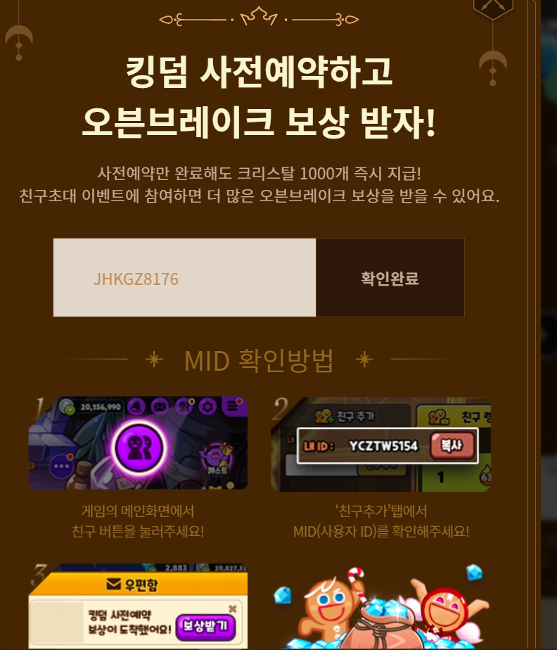쿠키런 오븐브레이크에 들어가 자신의 MID를 복사해서 입력해주시면 1000크리스탈 지급이 완료 됩니다.