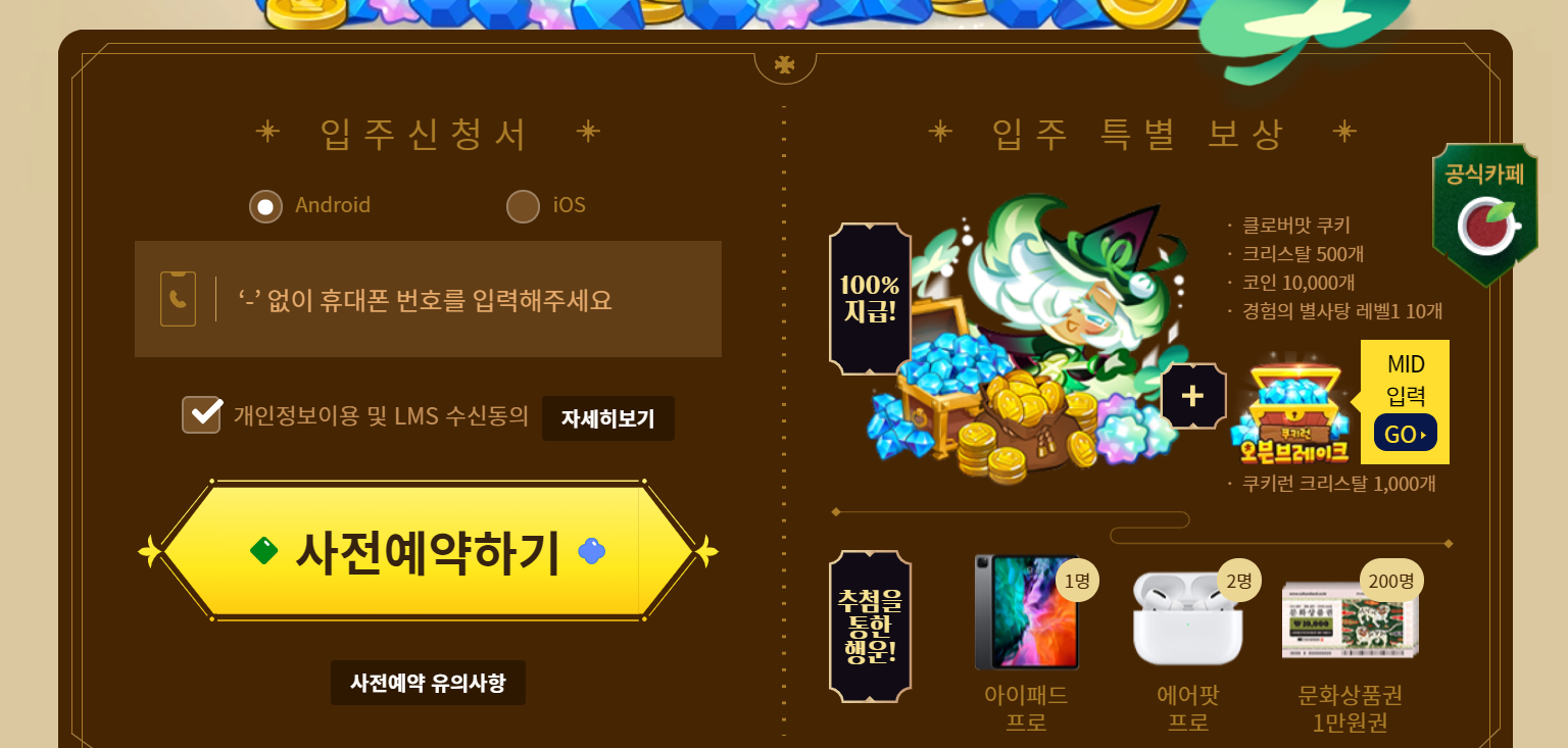 그다음에 입주 신청서에 자신의 휴대폰 번호와 Android인지 IOS인지 선택해 주신후 사전예약하기를 완료한다음.