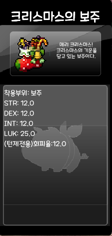 멀티인 PVP를 제외해서 싱글로 수급할 수 있는 유일한 보주! 럭을 제외한 나머지 스텟 12에 럭 25를 증가시켜주고!